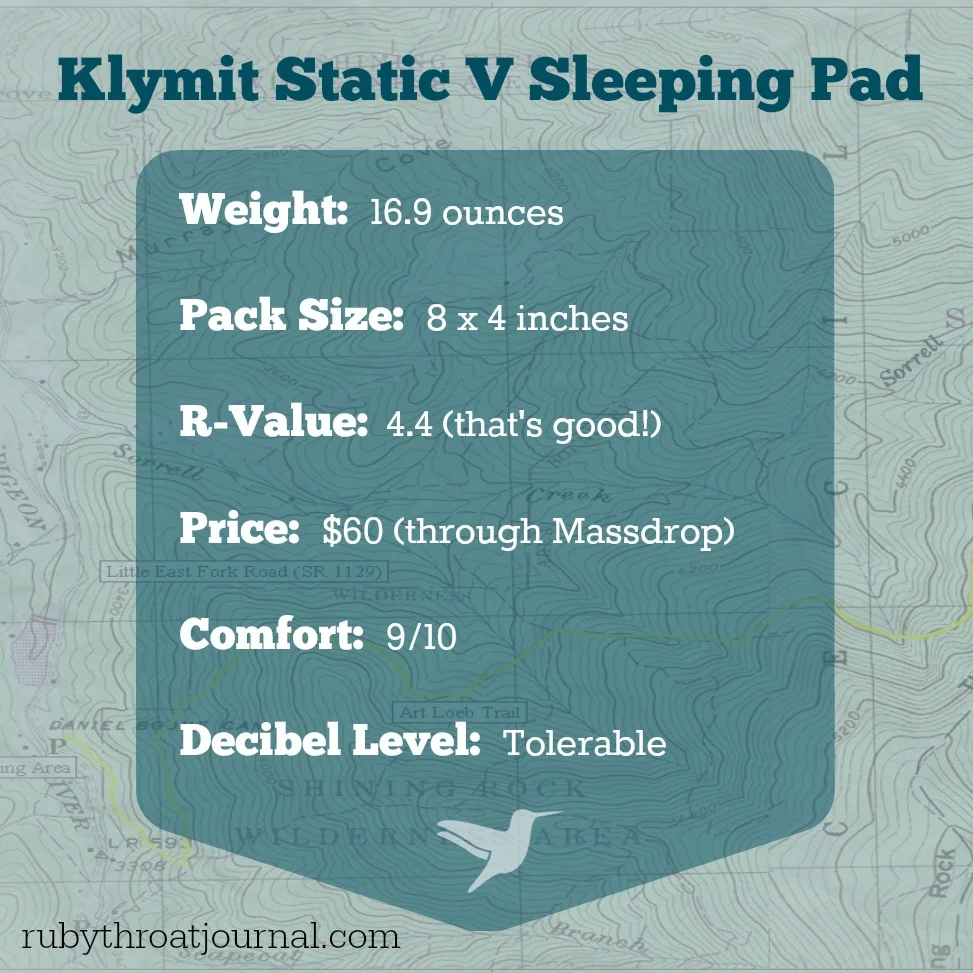 They offered the Klymit Static V Insulated Ultra Light Pad at $60 (normally $94). Reviews were solid and when I compared the specs with the Therm-a-Rest pads, well, there really was no comparison.