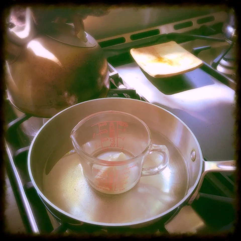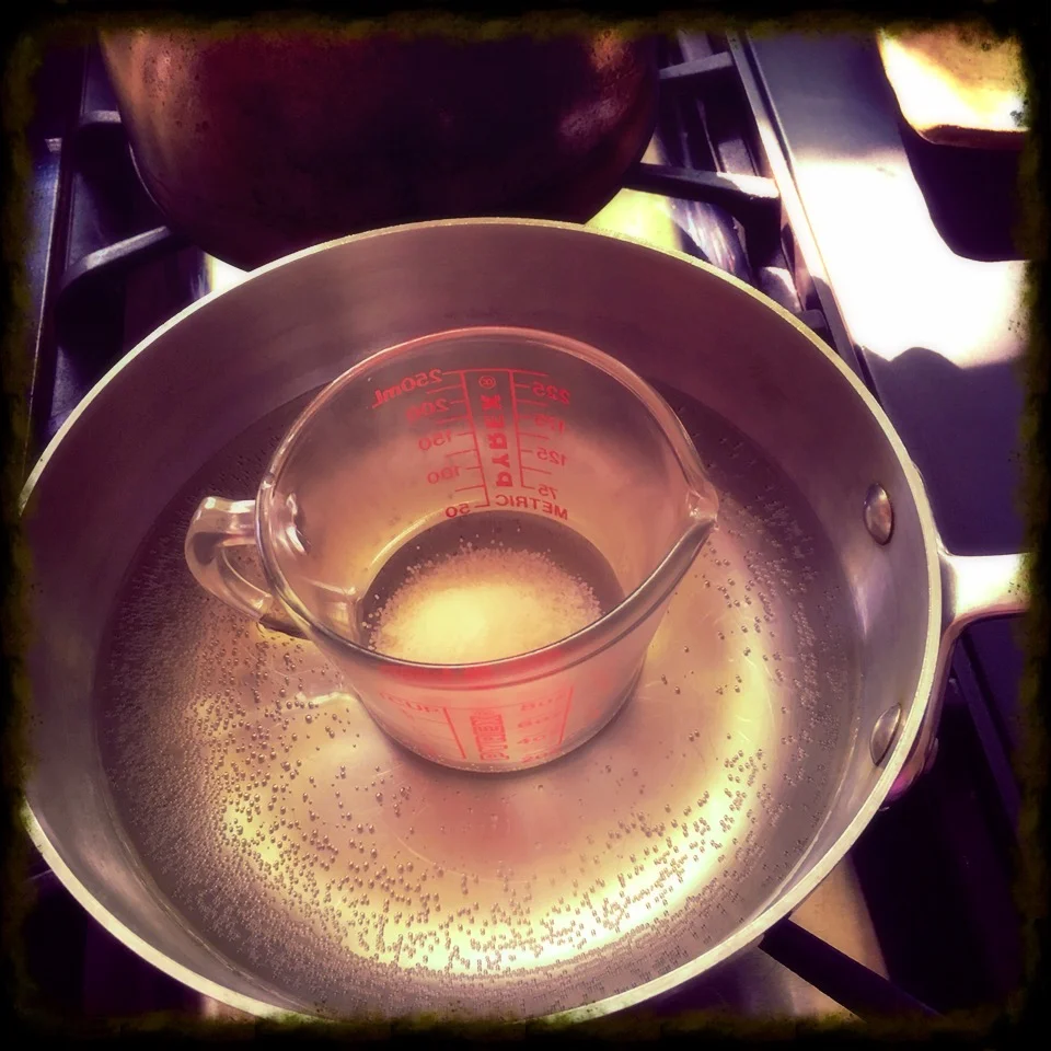 1. Melt the beeswax in a double boiler, or a pyrex measuring cup set in a pan of hot water.