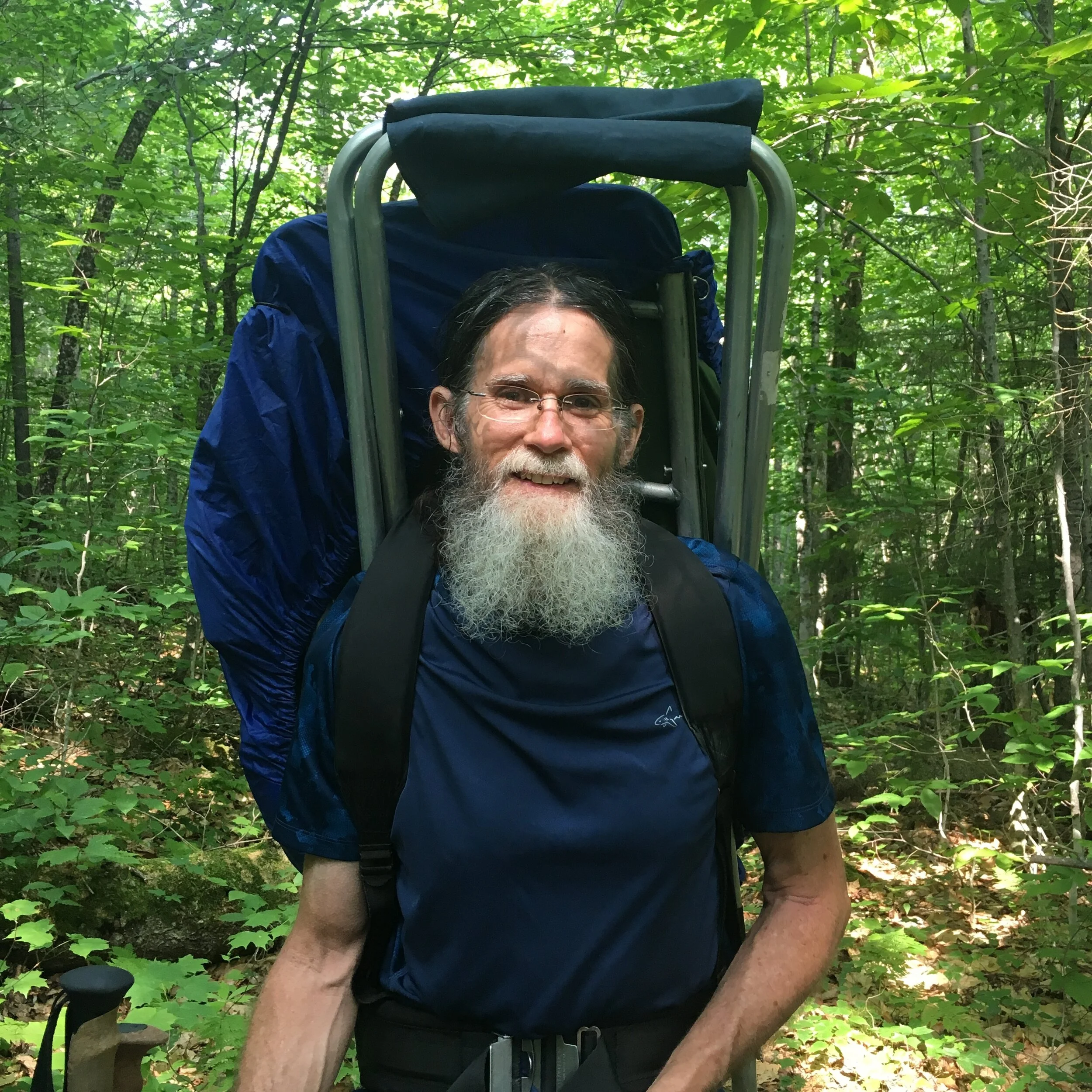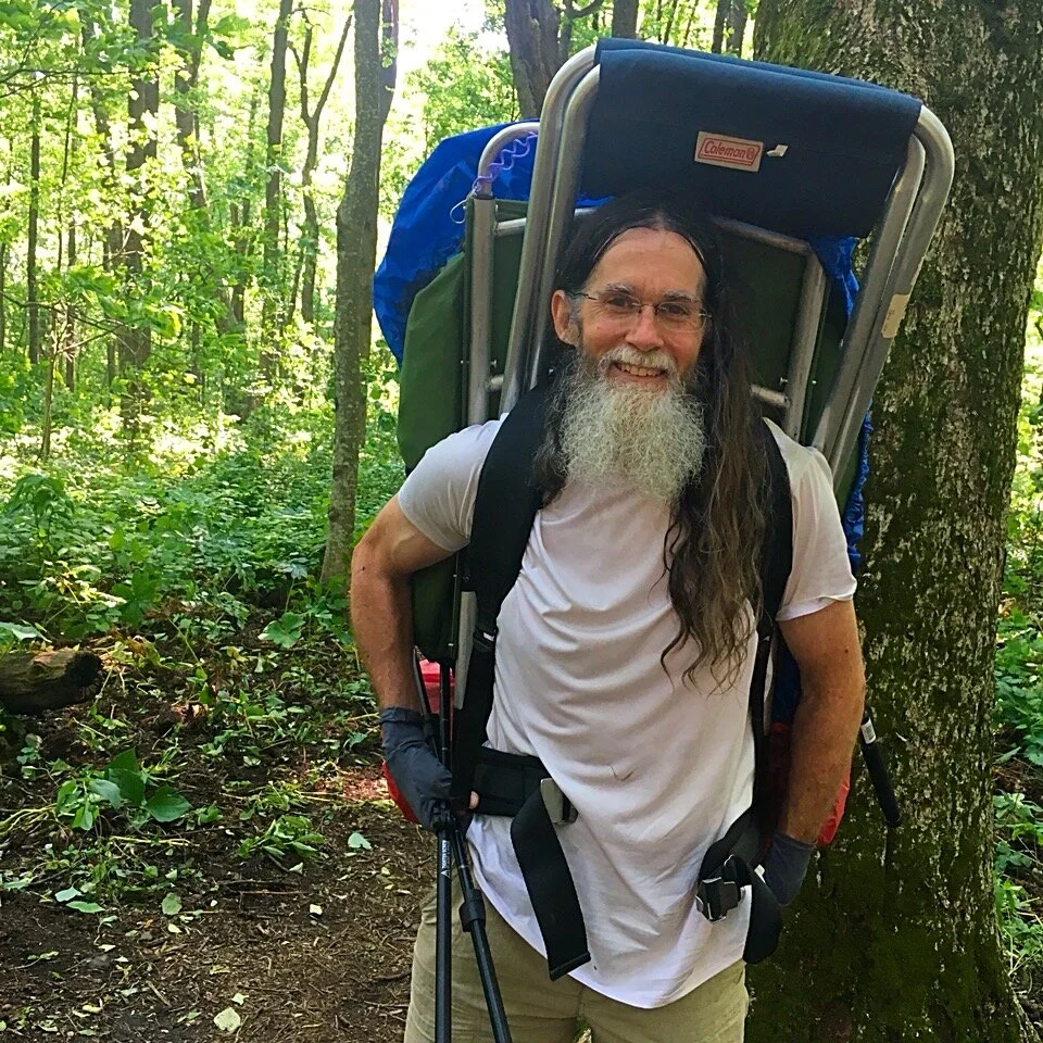 Crazy Carl, who was only hiking a section. I met him in Georgia in June, while I was finishing the southern end. He stood out because he carried a chair over his head. Two months later, I’m strolling north through the Hundred Mile Wilderness in Maine and a guy with a chair on his head rounds the corner just ahead, heading south. It’s Crazy Carl and one of those reunions that make the whole “No rain, no pain, no Maine” ordeal so special.