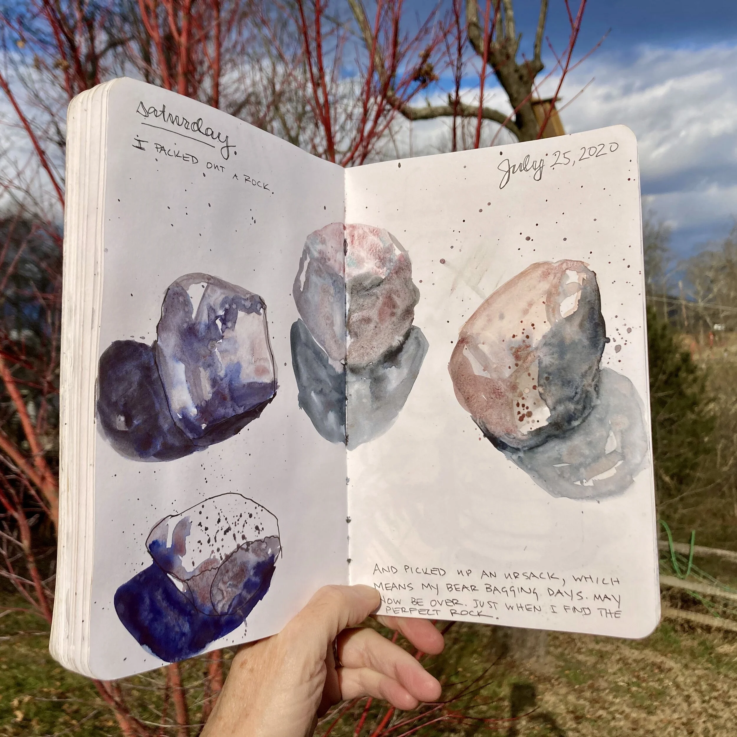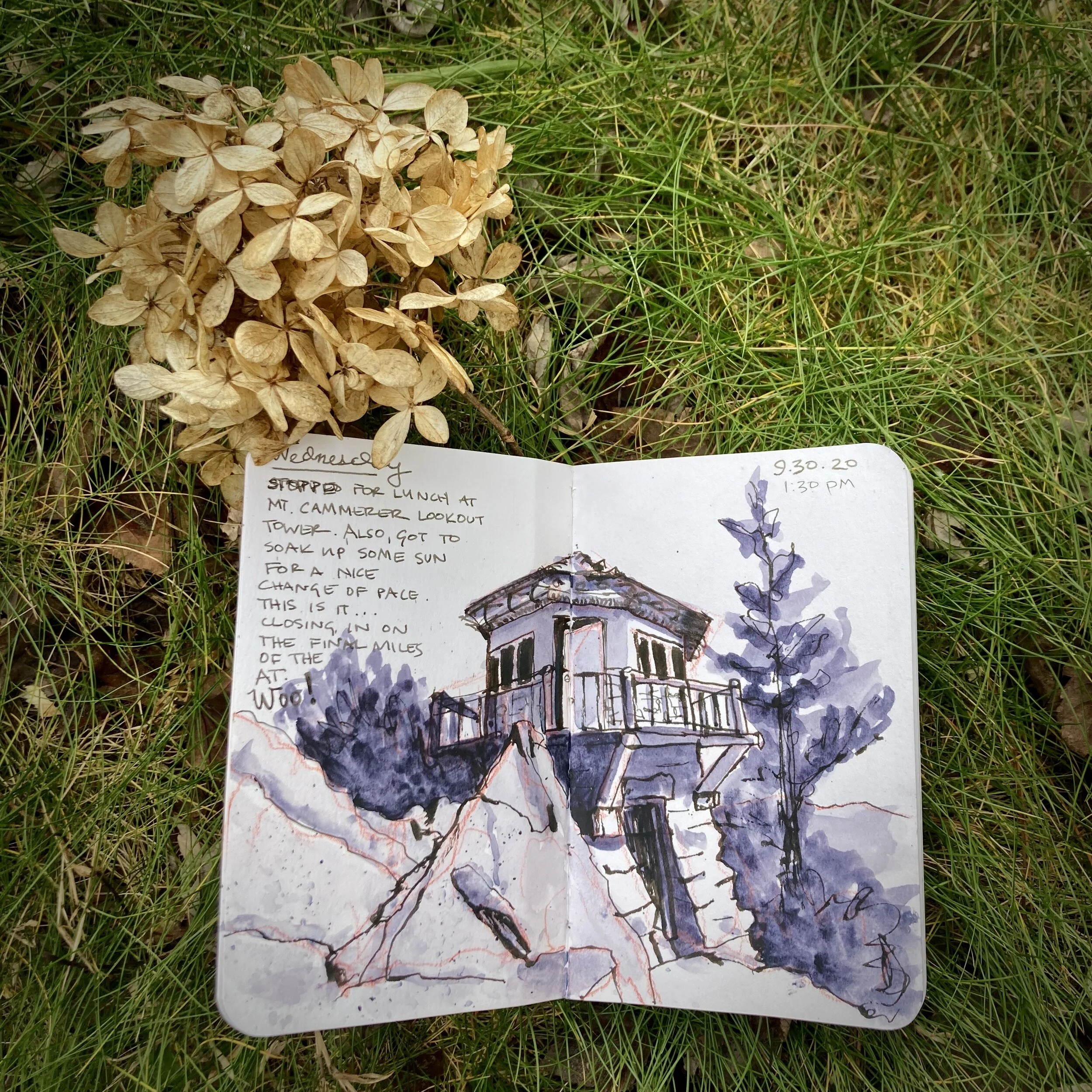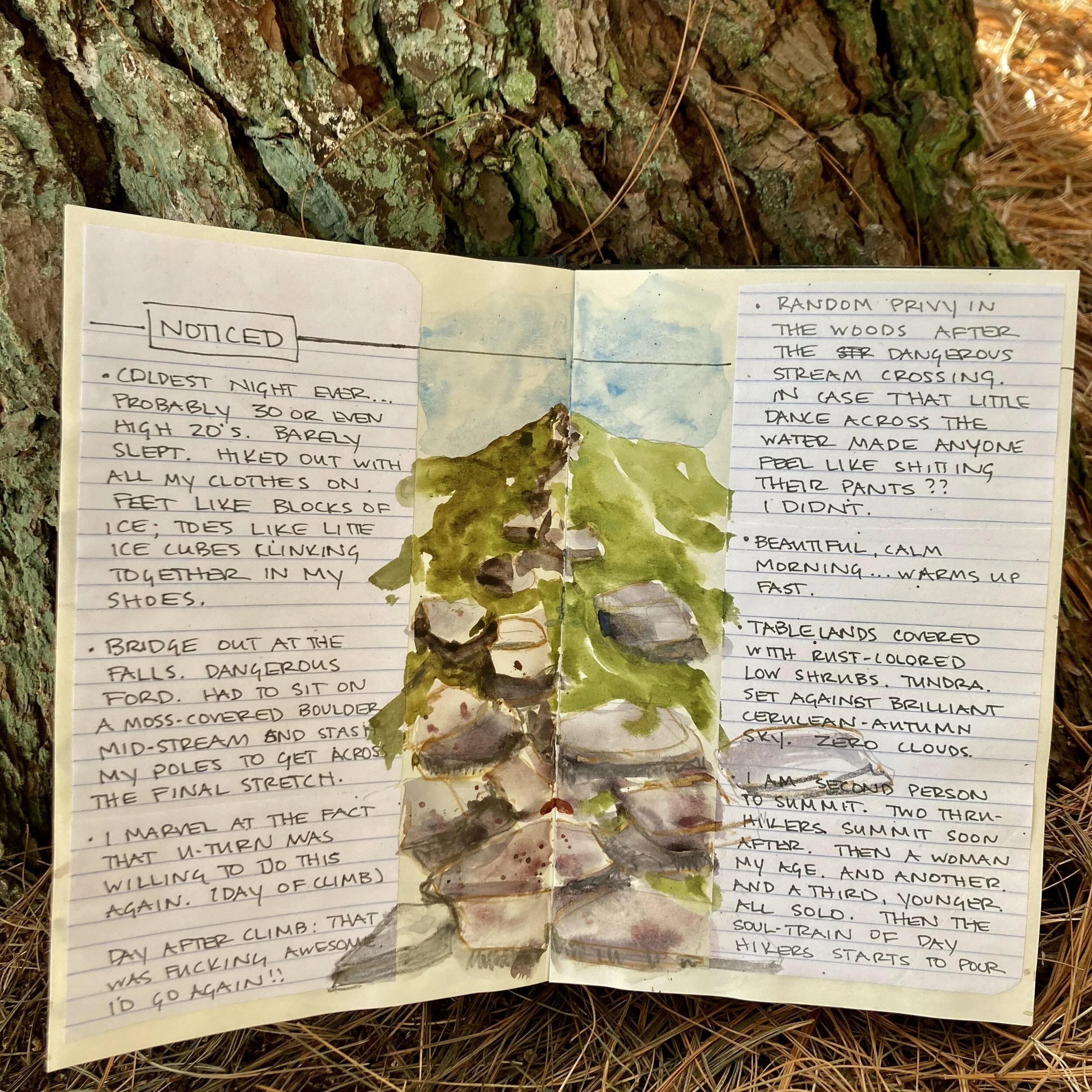 Plus, hiking is an analog activity that pairs well with analog documentation. And at the end of the hike, I have a tangible memento that is a distinct pleasure to hold in my hand. I like the feel of holding and perusing a completed notebook, pages warped by watercolor and ink and love.